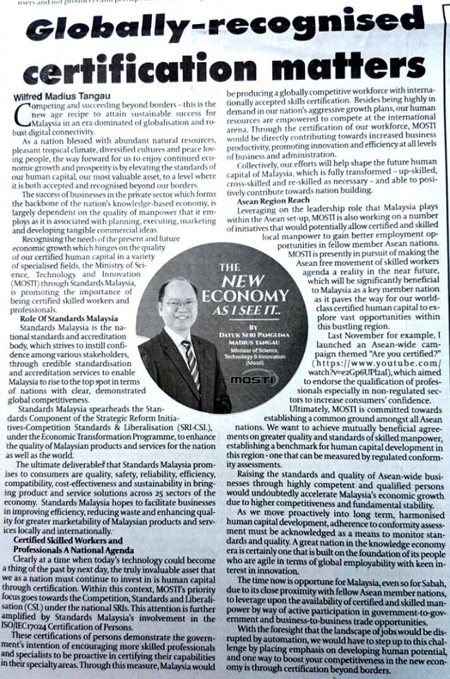 Recognising the need of the present and future economic growth which hinges on the quality of our certified human capital in a variety of specialised fields, the Ministry of Science, Technology and Innovation (MOSTI) through Standards Malaysia, is fully focussed on the agenda of promoting awareness on the importance of being certified skilled workers and professionals, amongst Malaysians at large.